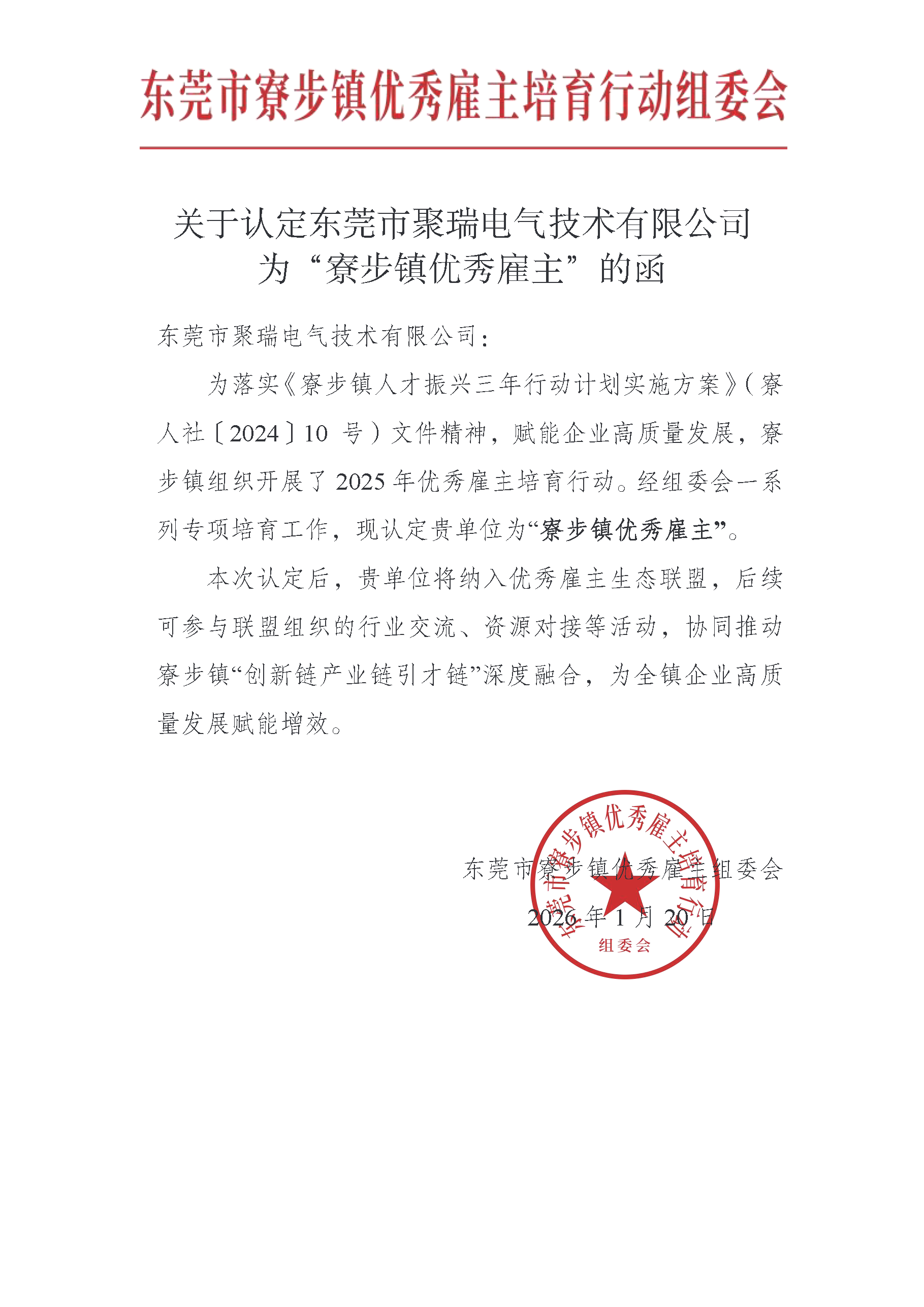 近日,東莞市寮步鎮2025年度"優秀雇主"評選結果公布,聚瑞電氣憑借在員工關懷、人才培養和企業文化建設方面的突出表現,榮獲此項榮譽。